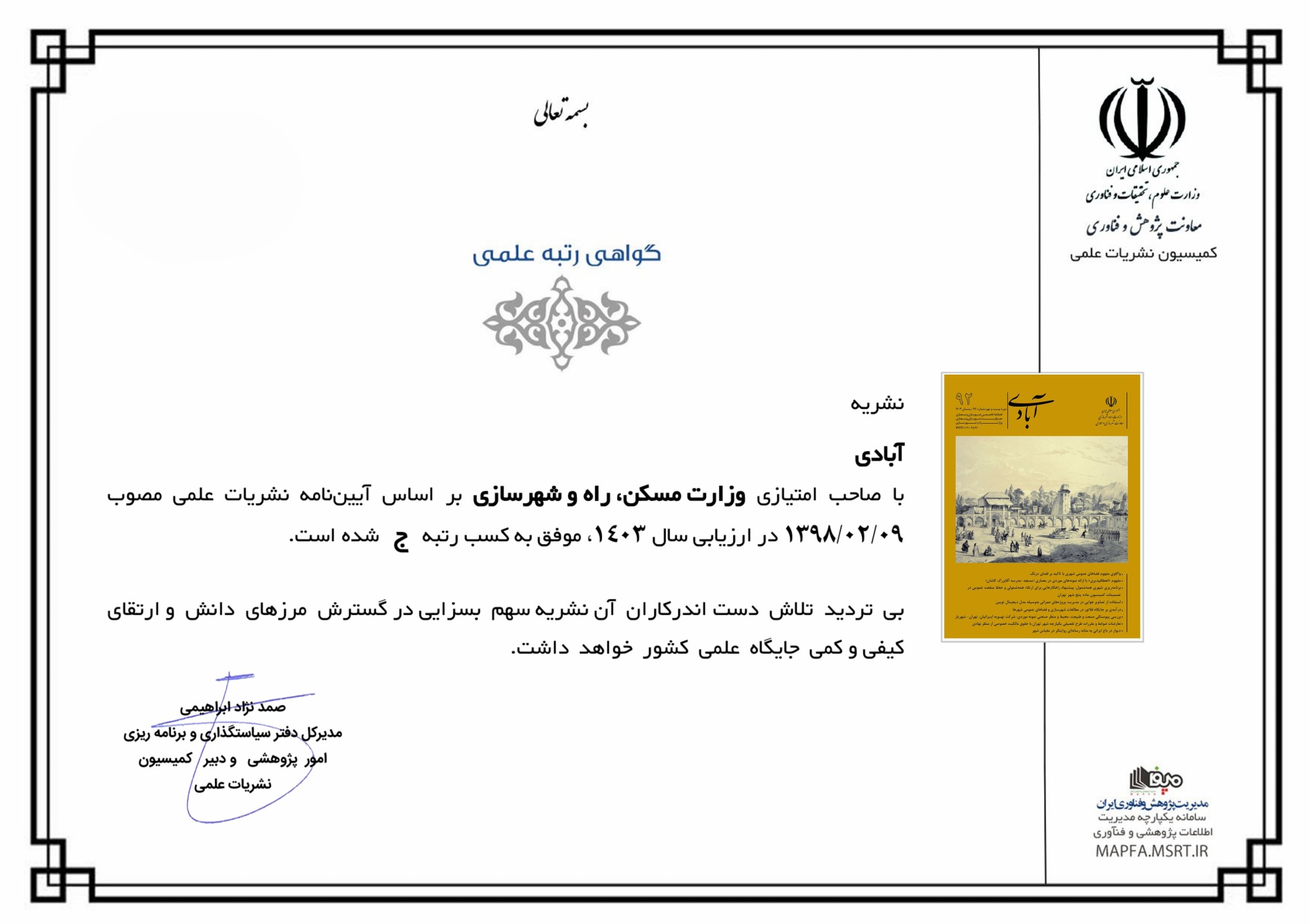 بدینوسیله به استحضار پژوهشگران، اساتید محترم و مخاطبان فرهیخته میرساند که نشریه آبادی در سال 1403موفق به دریافت امتیاز علمی–پژوهشی با رتبه «ج» از سوی کمیسیون نشریات علمی وزارت علوم، تحقیقات و فناوری شده است.